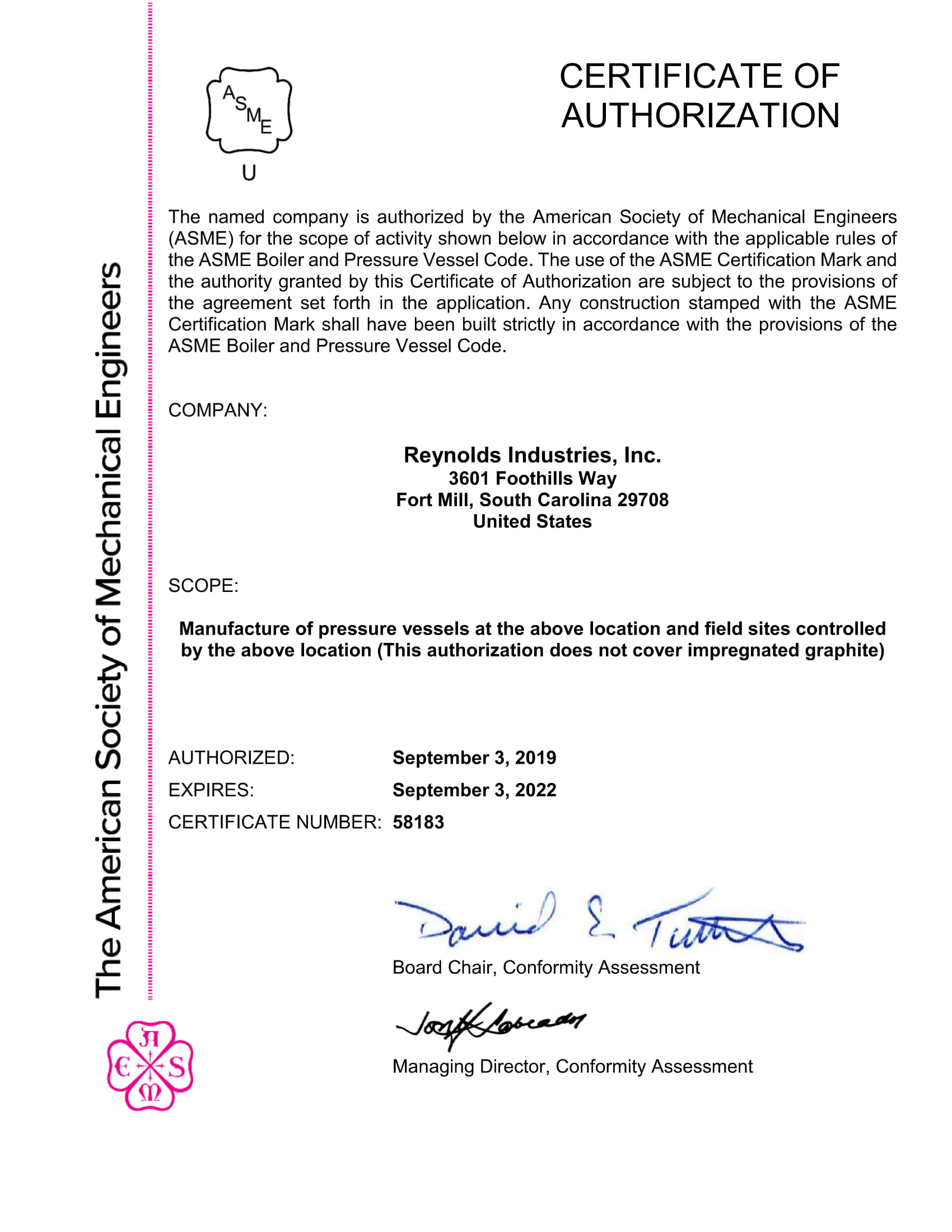 Reynolds Industries is 'U stamp' & 'R stamp' certified and an approved vendor for